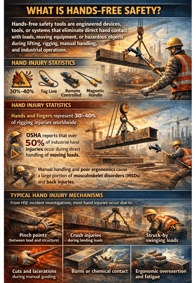 Hands-free safety tools are engineered devices, tools, or systems that eliminate direct hand contact with loads, moving equipment, or hazardous objects during lifting, rigging, manual handling, and industrial operations.